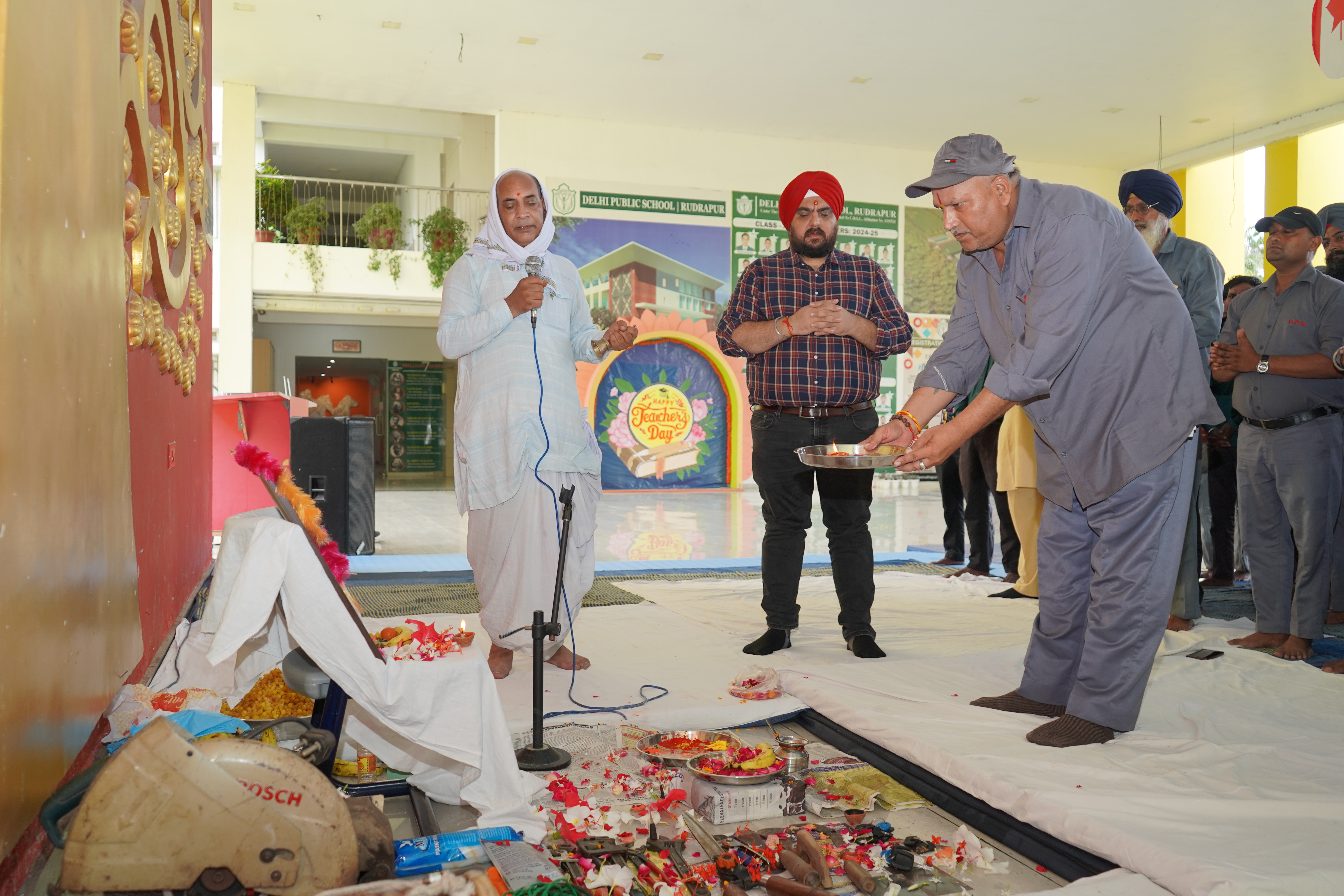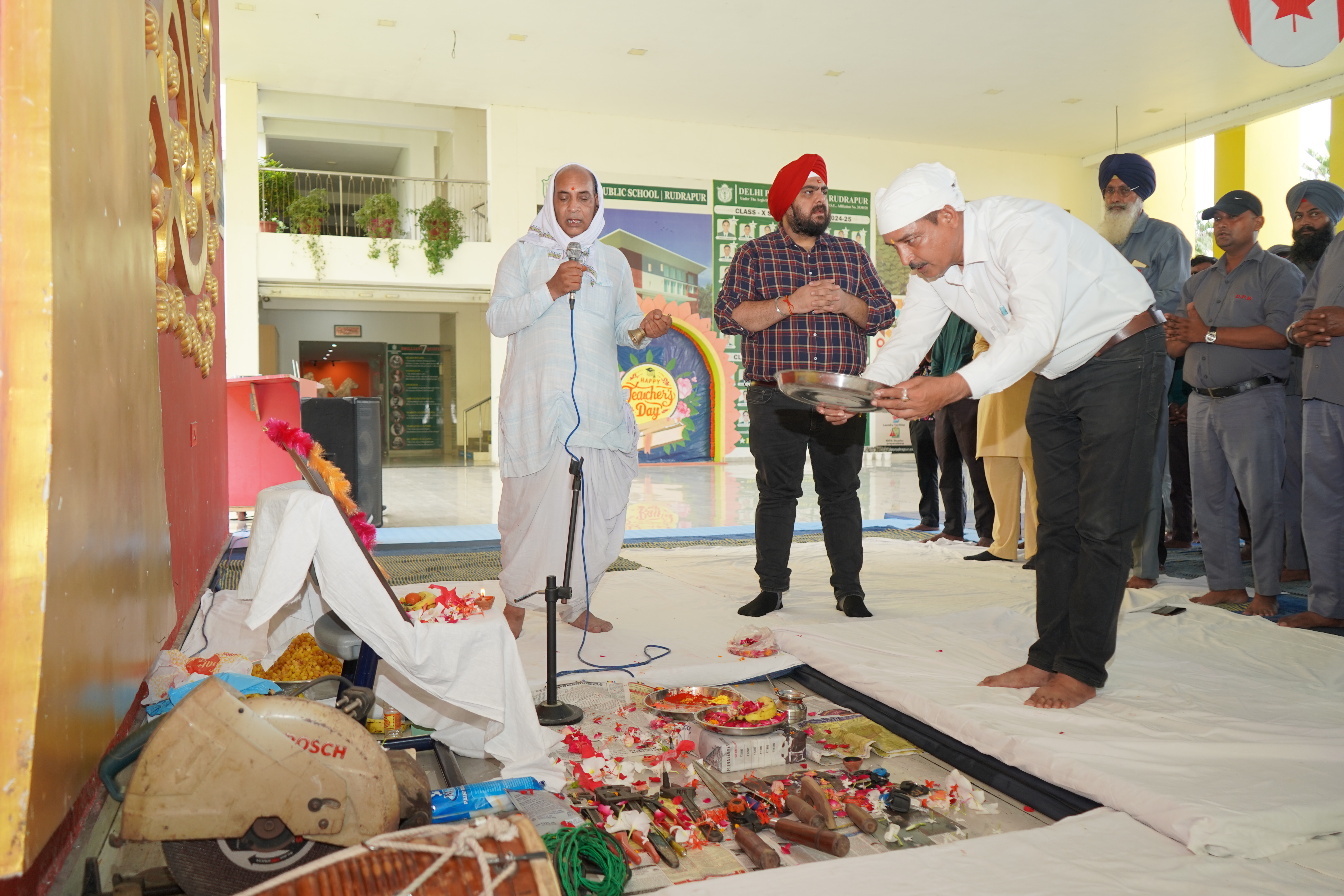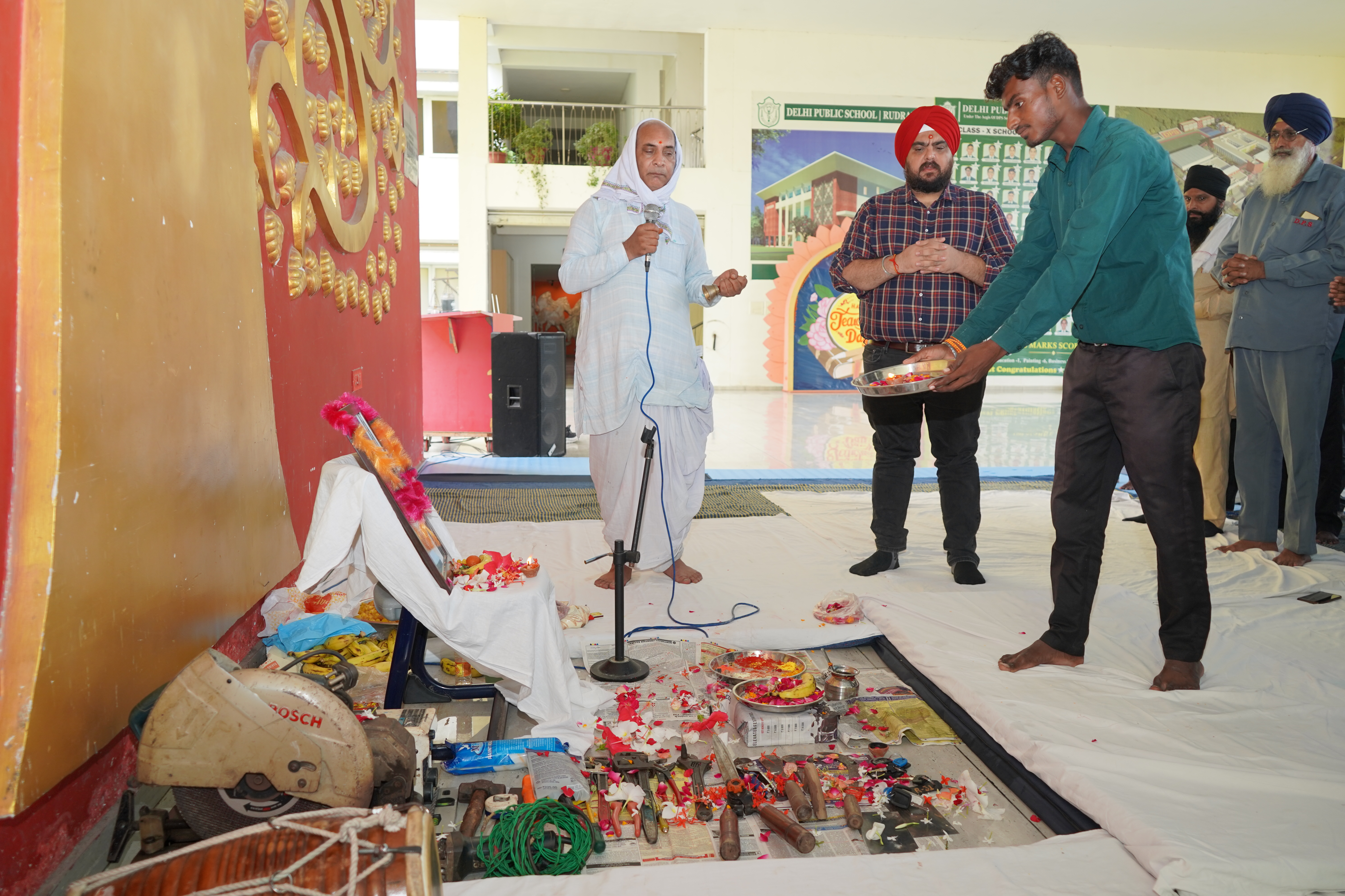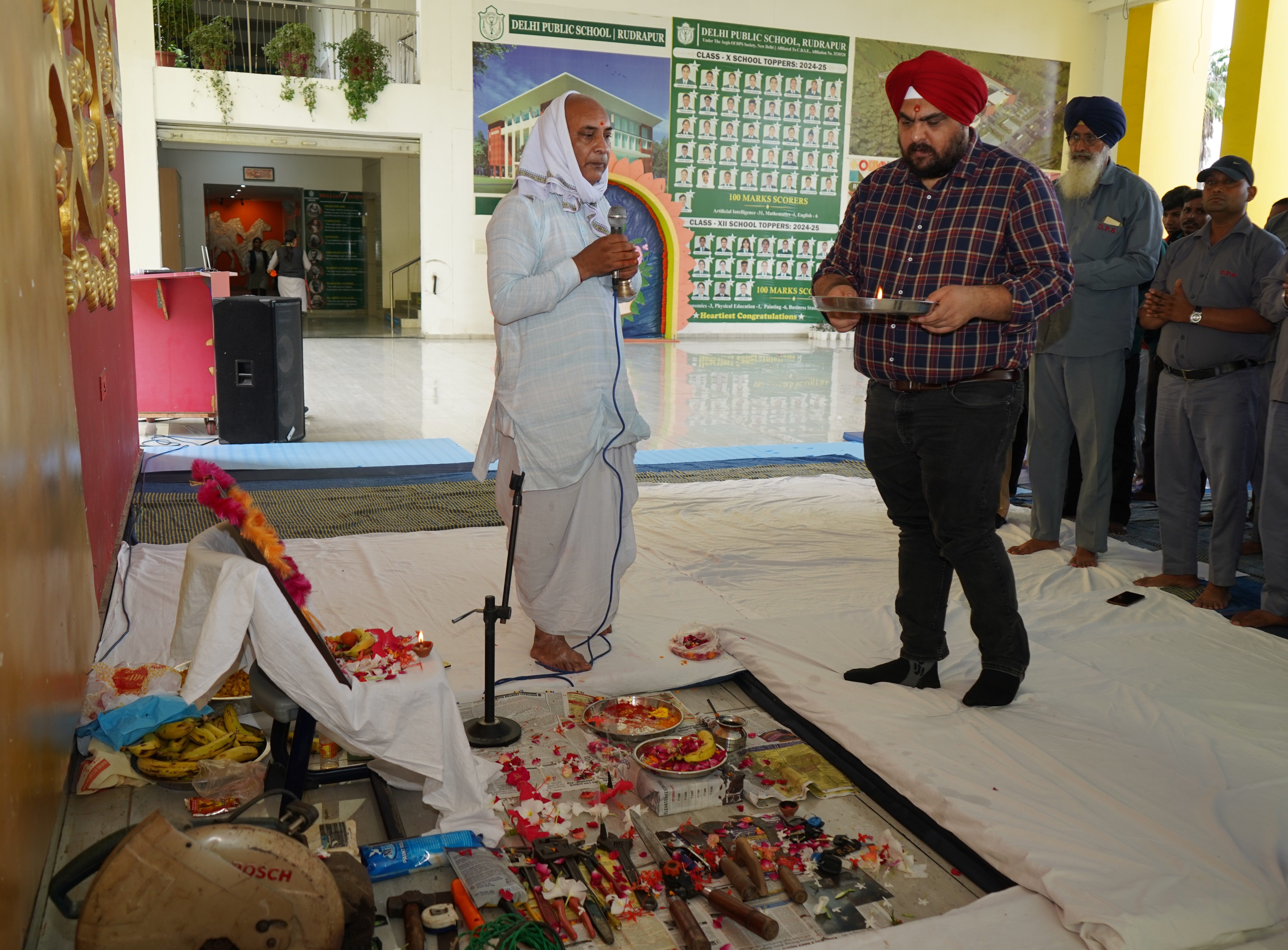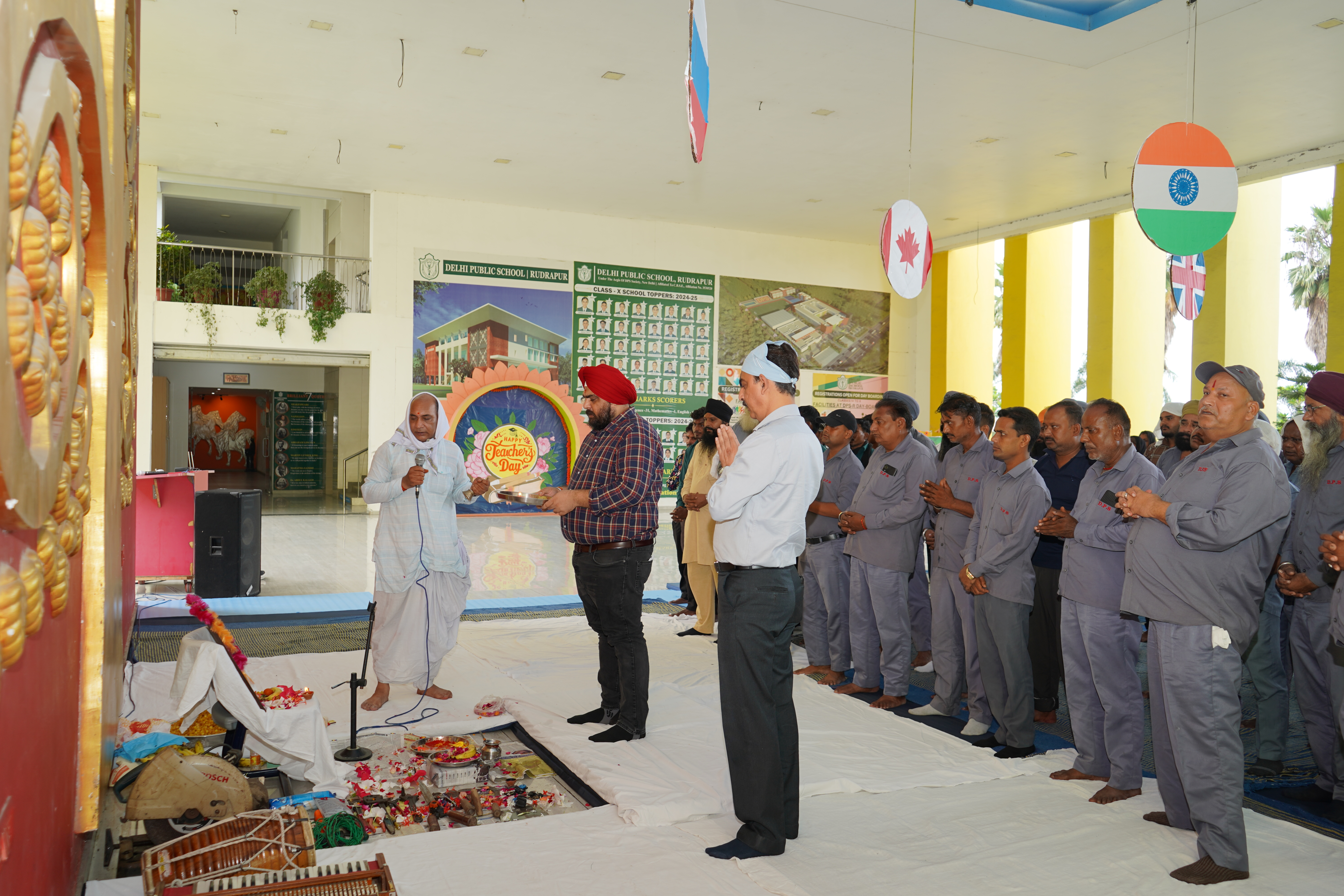 Delhi Public School, Rudrapur reverberated with devotion and reverence as the school family came together to celebrate Vishwakarma Puja. Lord Vishwakarma, revered as the divine architect and symbol of creation, innovation, and craftsmanship, was worshipped with traditional rituals, havan, and bhajan kirtan.