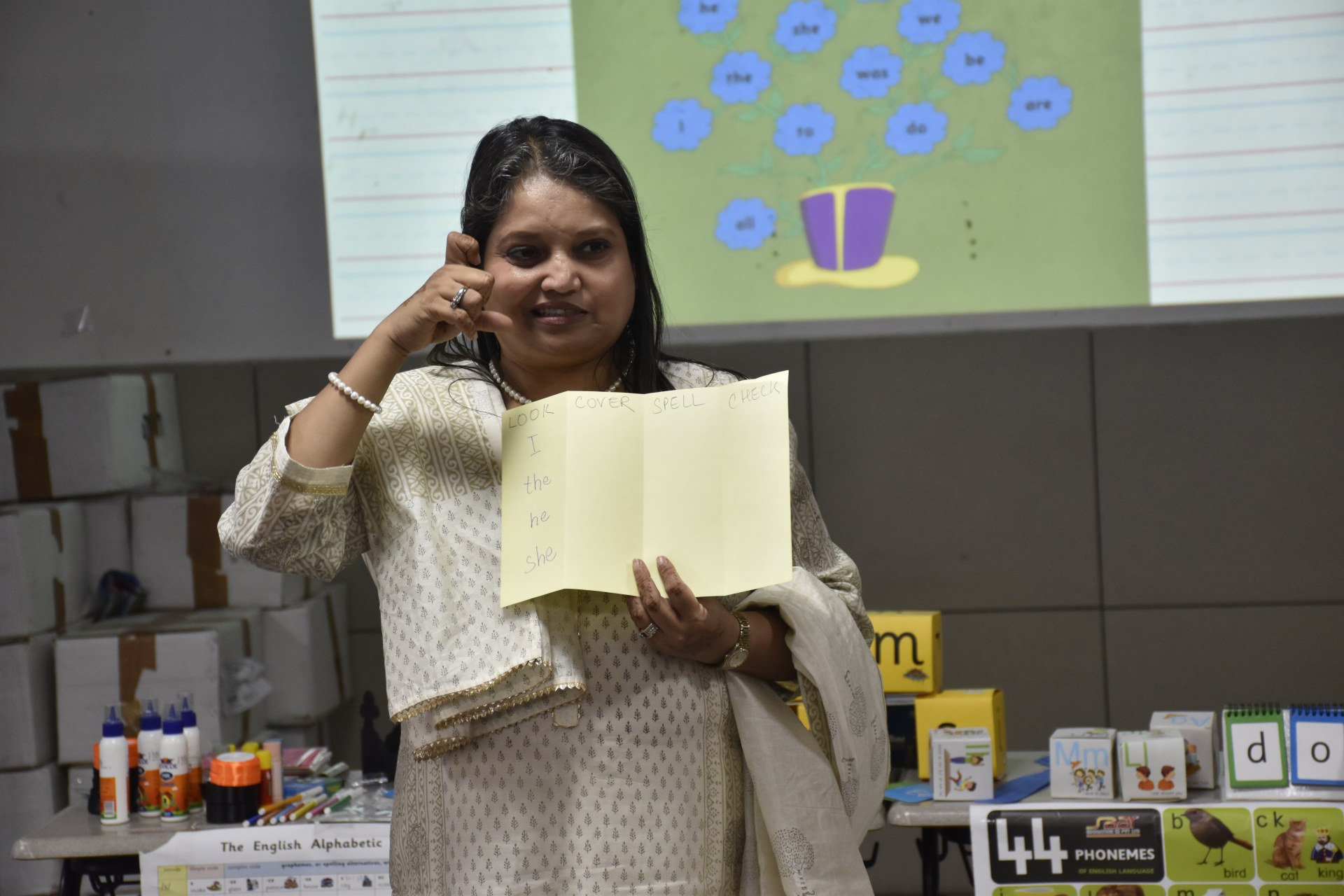 The workshop focused on building strong foundational reading skills through multi-sensory phonics learning techniques. Teachers gained deeper insights into pure letter sounds and the correct pronunciation of the 42 phonetic sounds, which are essential for effective phonics instruction and early reading development.